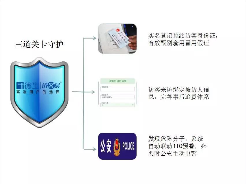 德生訪客易升級安全體系,打造三道關卡:一、身份證識別并實名登記;二、訪客來訪綁定被訪人信息;三、將訪客信息實時與公安網高危人員數(shù)據(jù)庫進行比對,三道關卡守護,防止危險分子進入。