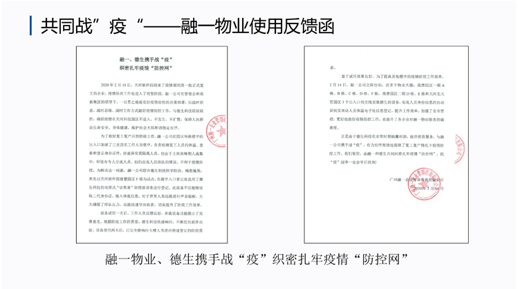 鑒于試用效果良好,為了提高其他樓宇的疫情防控工作效率,棟、B棟、C棟、D棟、F棟,高唐園區(qū)二期D棟、E棟和天河北天貿(mào)園區(qū)3個出入口均全線安裝德生的設備,實現(xiàn)人員身份信息的自動 識別及來訪人員體溫電子化信息登記,提升工作效率,加強了安全管理,更好地做好疫情防控工作,也提升了各企業(yè)對融一物業(yè)服務的滿 息度。