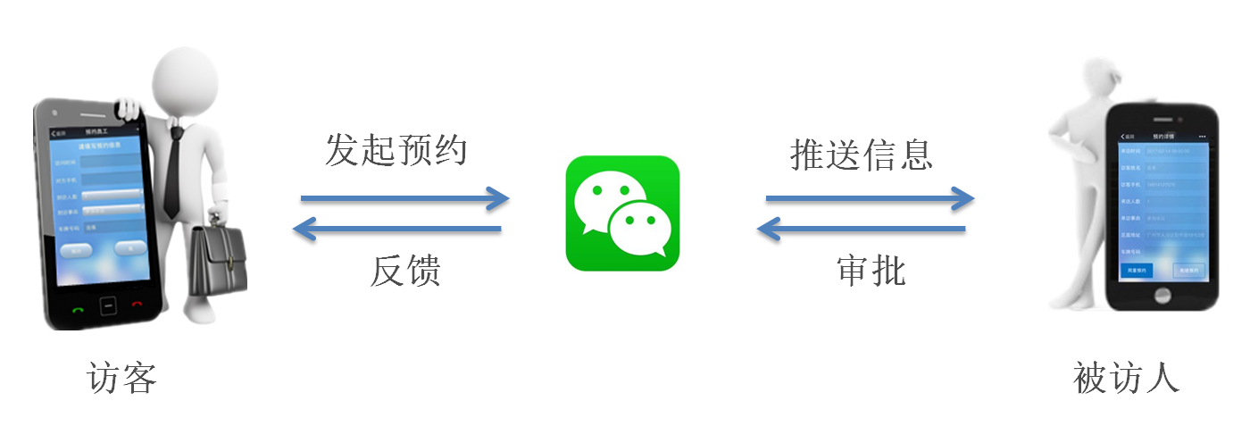 訪(fǎng)客在微信公眾號(hào)和B/S網(wǎng)頁(yè)上發(fā)起預(yù)約,被訪(fǎng)人通過(guò)微信/網(wǎng)頁(yè)審批邀約信息,實(shí)現(xiàn)端到端實(shí)時(shí)通訊