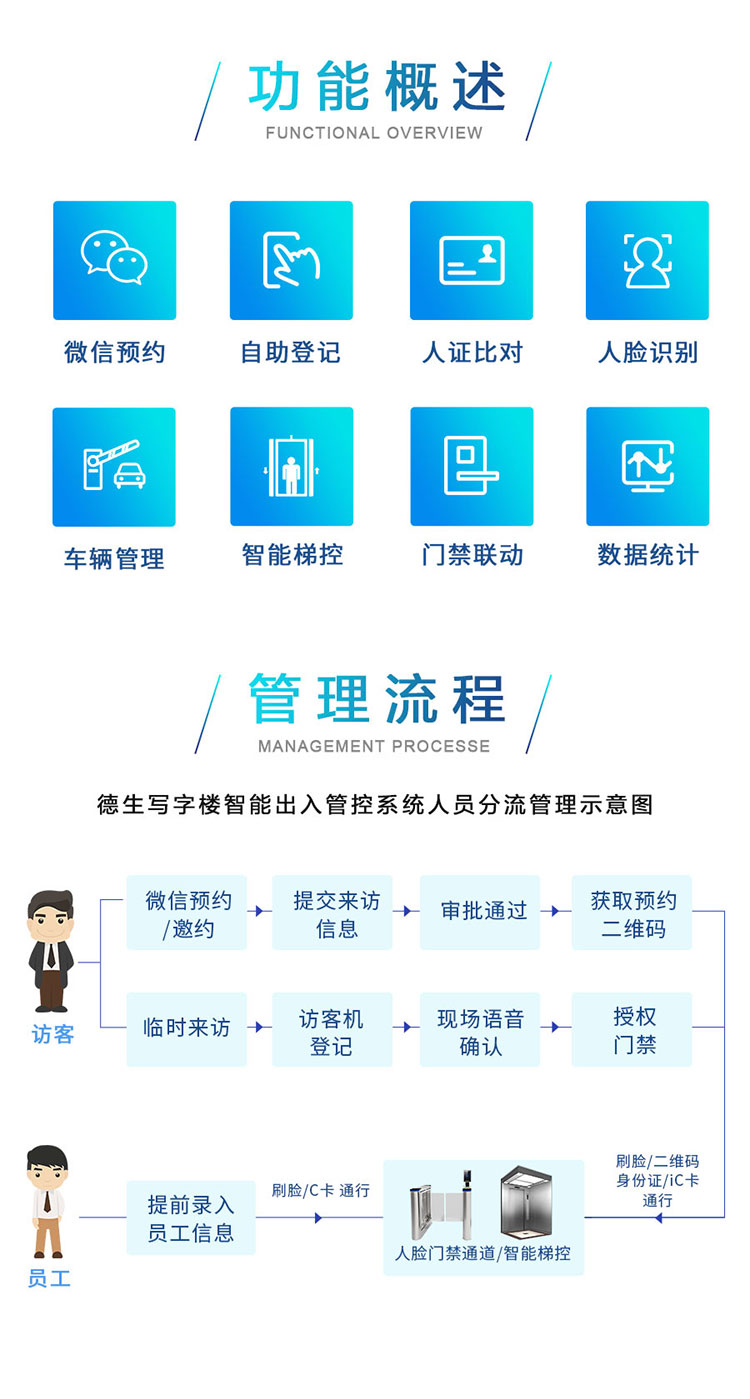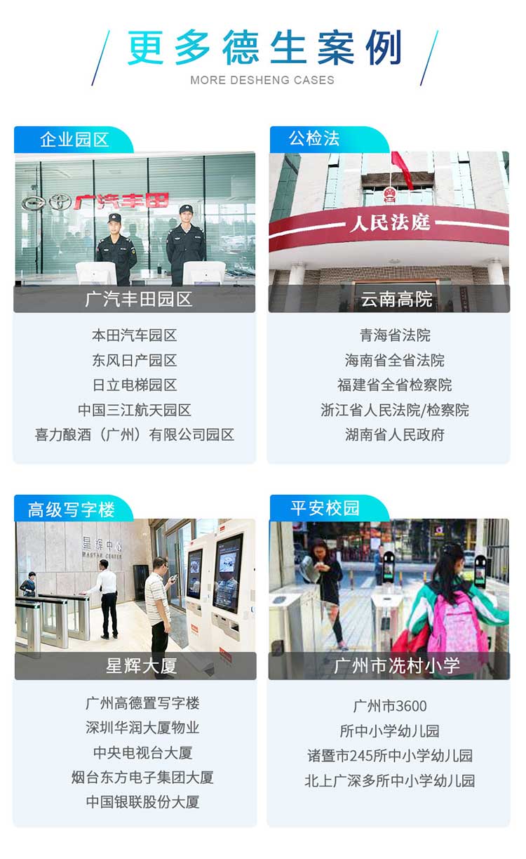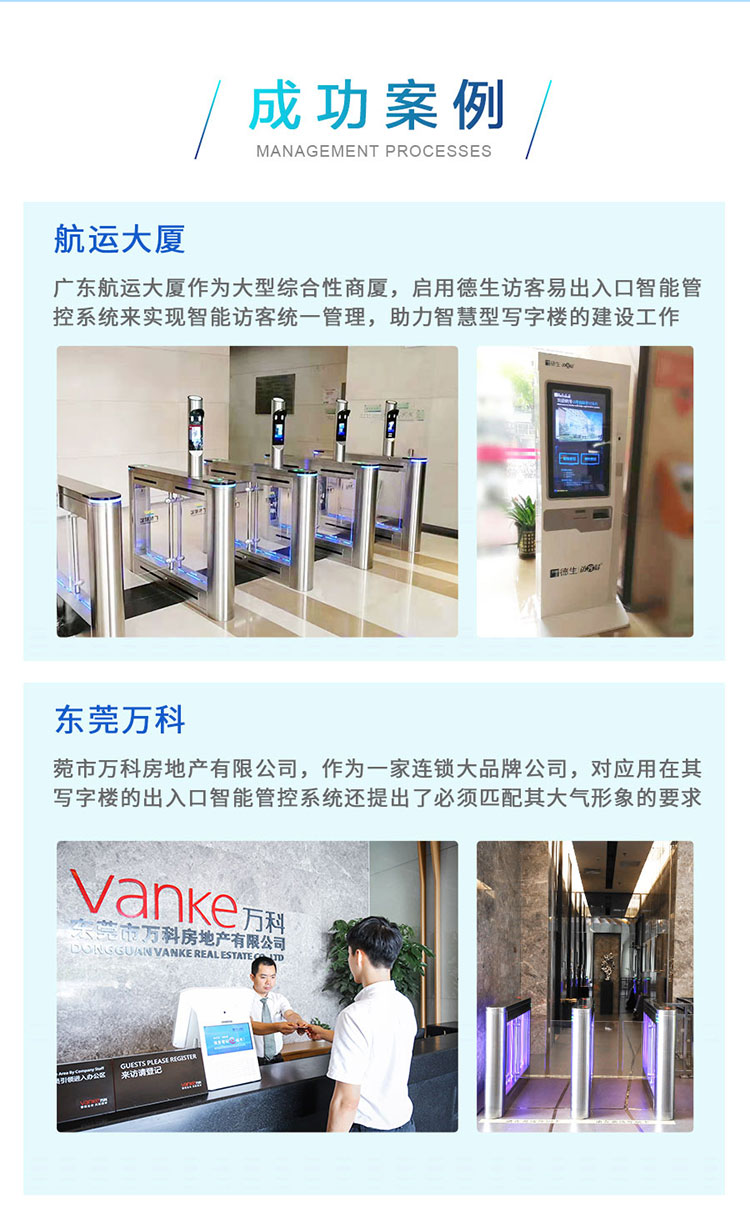 德生寫字樓訪客系統(tǒng)解決方案,能夠?qū)崿F(xiàn)微信預(yù)約,現(xiàn)場來訪登記,現(xiàn)場錄入人臉,授權(quán)人臉、身份證過閘機(jī),能夠聯(lián)動(dòng)門禁/梯控等,提高寫字樓的安全防護(hù),打造高效有序的訪客管理模式!