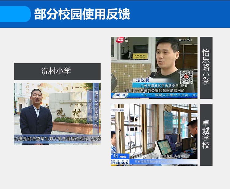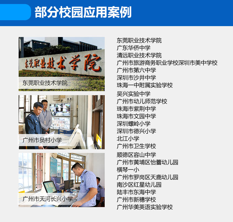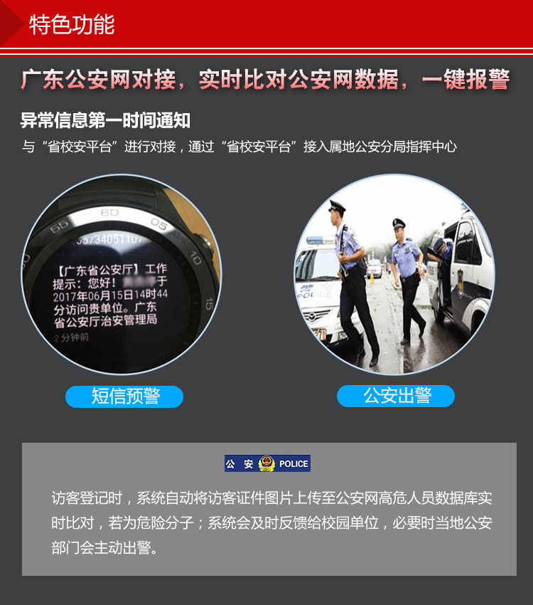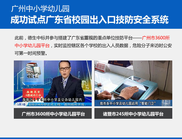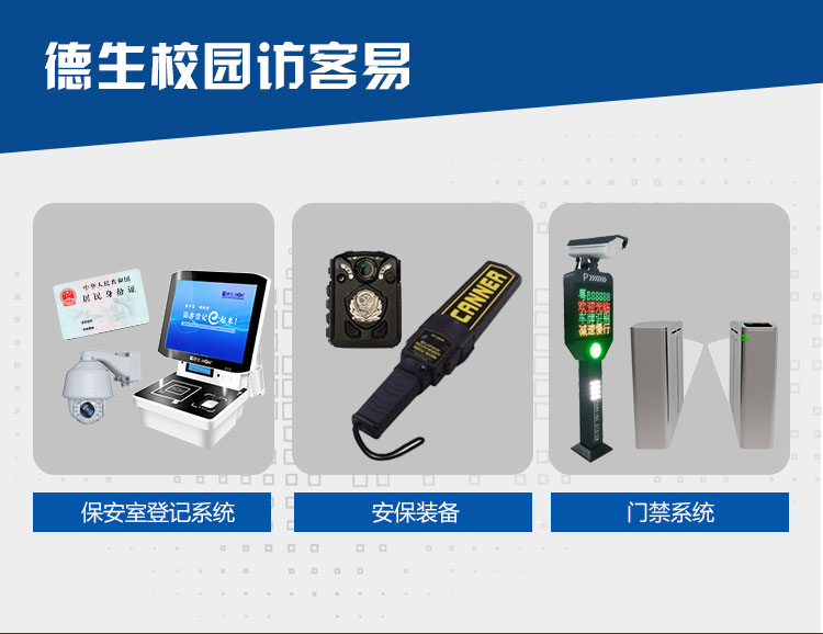 根據(jù)《廣東省安全技術(shù)防范管理?xiàng)l例》,廣東省各學(xué)校應(yīng)配備學(xué)校技防系統(tǒng),加強(qiáng)平安校園建設(shè)。德生訪客易作為具備廣東省公安網(wǎng)上傳對(duì)接功能的廠家,全力推出學(xué)校技防產(chǎn)品,包括保安室登記系統(tǒng)、學(xué)校門禁系統(tǒng),學(xué)校安保裝備,加強(qiáng)學(xué)校主要出入口三防管理,建設(shè)安全校園,便于學(xué)校統(tǒng)一管理,將人員信息對(duì)接公安網(wǎng),實(shí)時(shí)公安預(yù)警,防止危險(xiǎn)分子混入校園,維護(hù)校園秩序和公共安全。