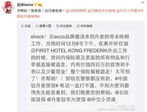 12月7日,女星劉濤在微博求助,稱(chēng)自己到丹麥?zhǔn)锥几绫竟ぷ鲿r(shí)遭遇盜竊,所住酒店房間內(nèi)的保險(xiǎn)箱和行李被盜走,內(nèi)有價(jià)值400萬(wàn)的首飾手表以及少量現(xiàn)金,“整個(gè)保險(xiǎn)箱被盜走!太可怕了!求幫助!”此外,劉濤還曬出所住酒店的房卡。