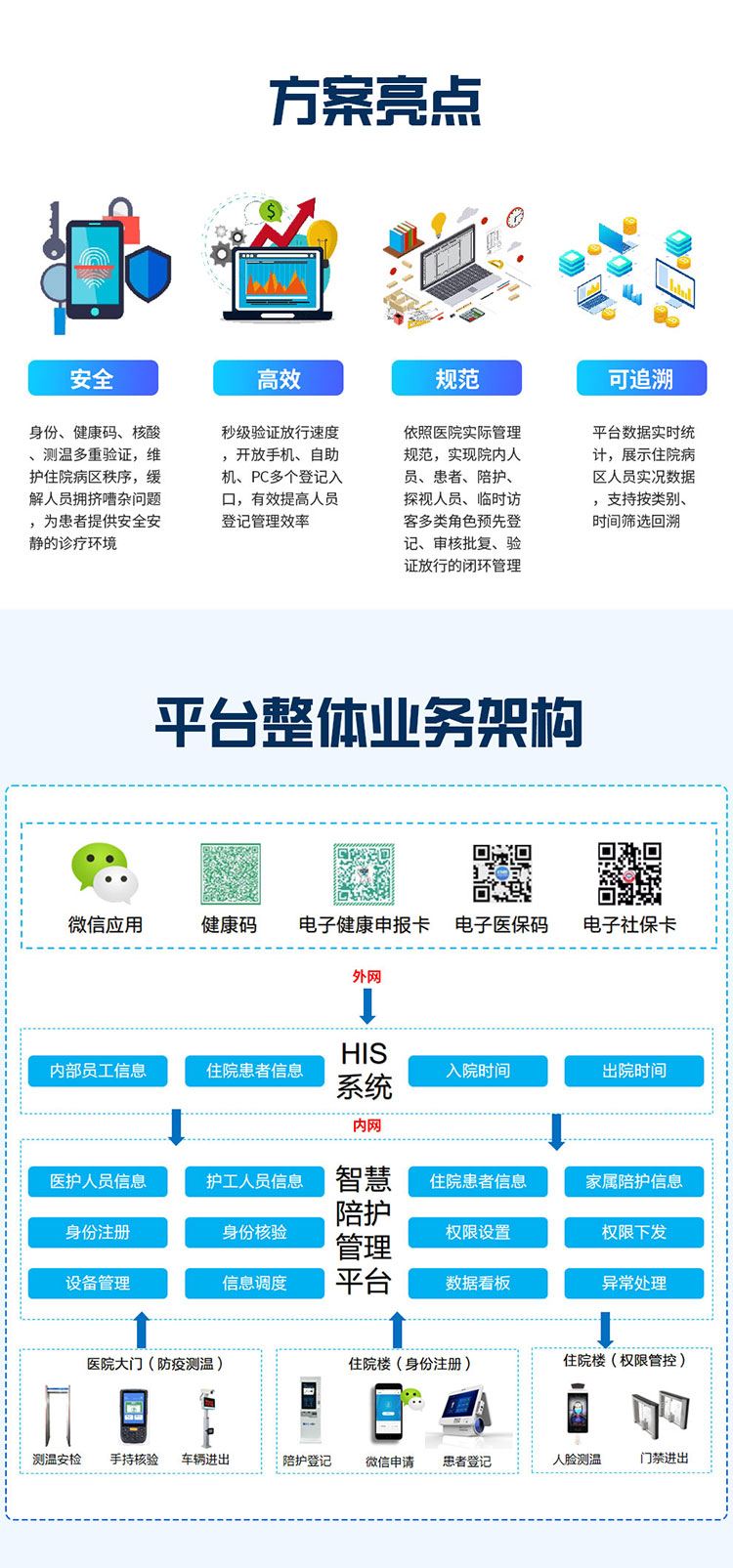 智能出入管理系統(tǒng),滿足患者、患者親友和醫(yī)護(hù)人員以及其他訪客的多種需求,實(shí)現(xiàn)醫(yī)院出入口管控、信息智能化考勤、出診、就診管理,提高工作效率。