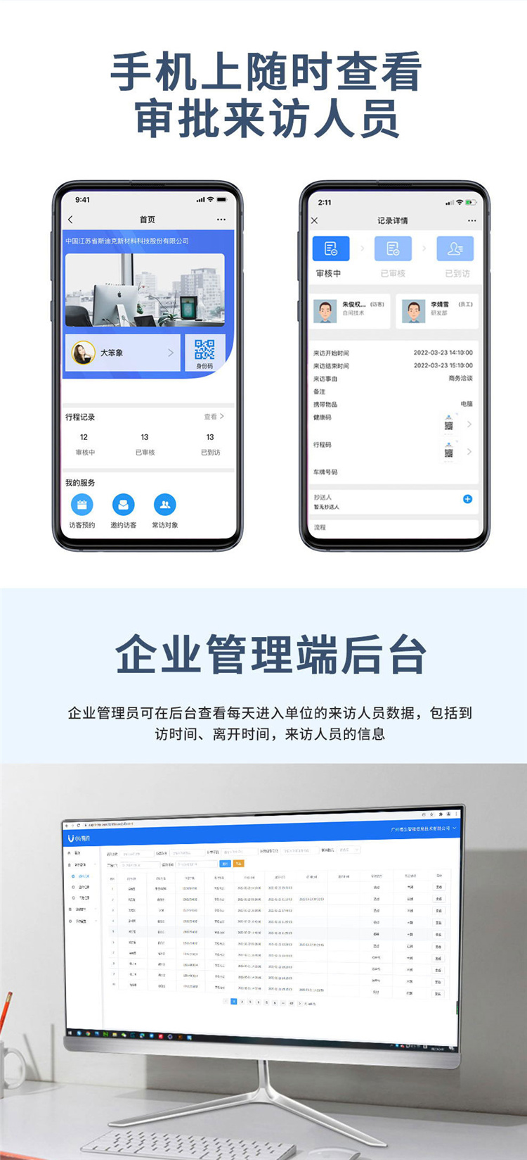 當(dāng)前位置:首頁(yè) > 產(chǎn)品中心 > 訪客機(jī) > 微信訪客預(yù)約系統(tǒng) 對(duì)接釘釘/可選多級(jí)審批